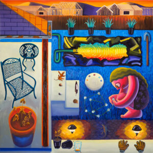 Natalie Wadlington, currently based in Brooklyn, blends influences from American regionalism, Latin American muralism, and Renaissance painting into a cubist style that explores psychological and environmental themes.